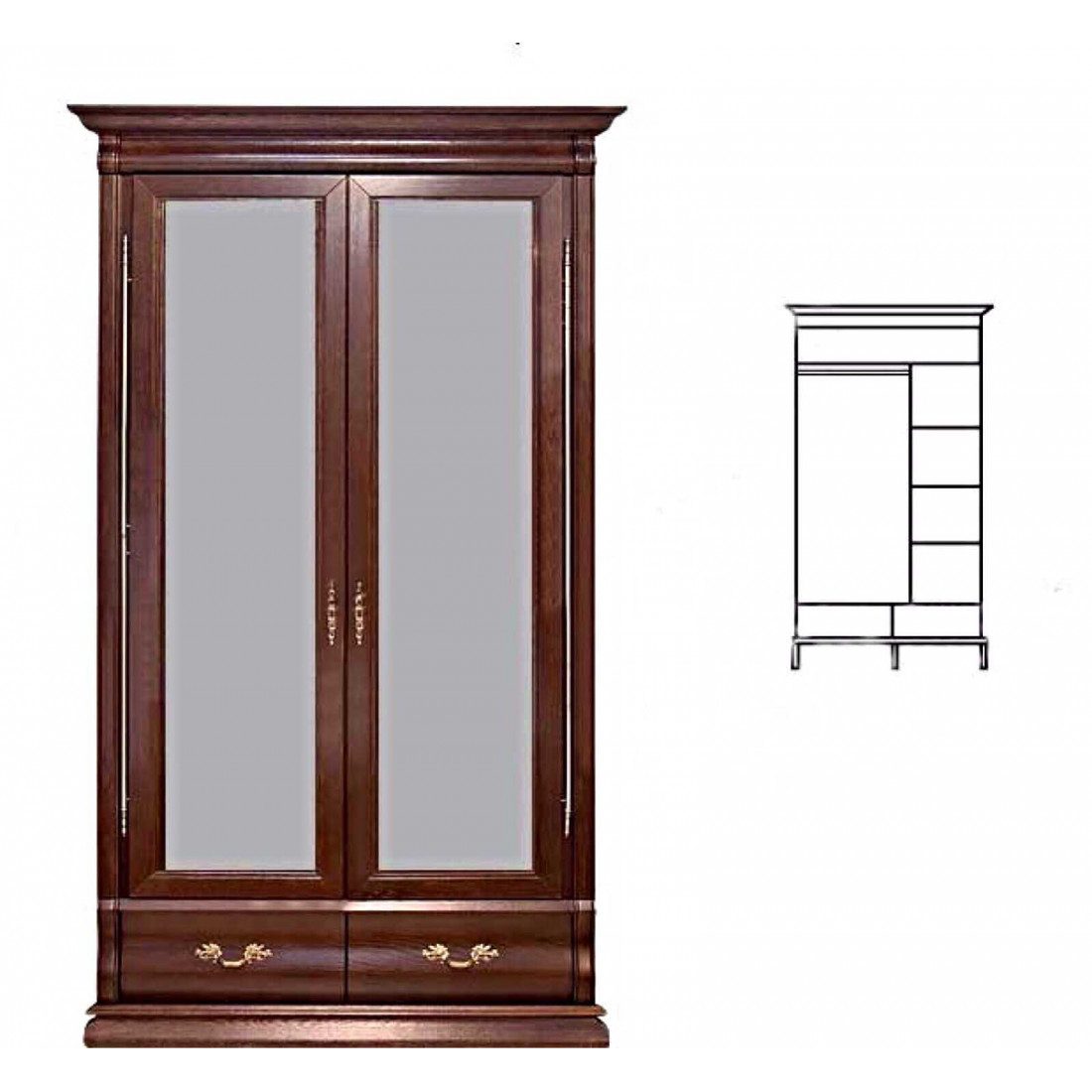 Классический двухдверный гардероб с зеркалами из коллекции мебели для спальни "Оскар" прекрасно впишется в интерьер спальни. Декорирован высокими карнизами и зеркальной поверхностью на дверцах. Модель выполнена в цветовом решении орех.