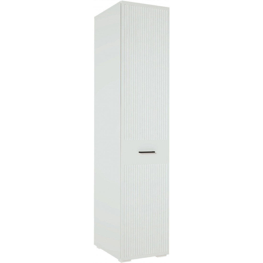 -Фасад выполнен из МДФ с декоративной фрезеровкой в виде вертикальных полос и окутаны плёнкой ПВХ цвета «Белый матовый»;